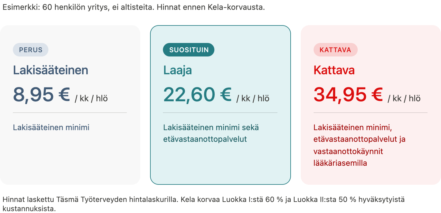 Hinta riippuu siitä, minkä kokoinen yritys on kyseessä ja kuuluuko työhön altisteita. Laske oma hintasi täältä suoraan (saat hinnan heti).